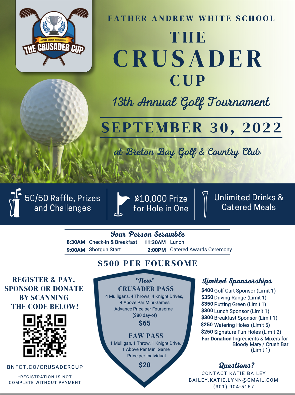 FAW Crusader Cup: It’s almost time for our 15th year of FAW’s Famous Golf Tournament. Join us for this can’t miss event on Friday, October 17th, 2025, just after the highly anticipated reopening of the newly reseeded Breton Bay Golf and Country Club.