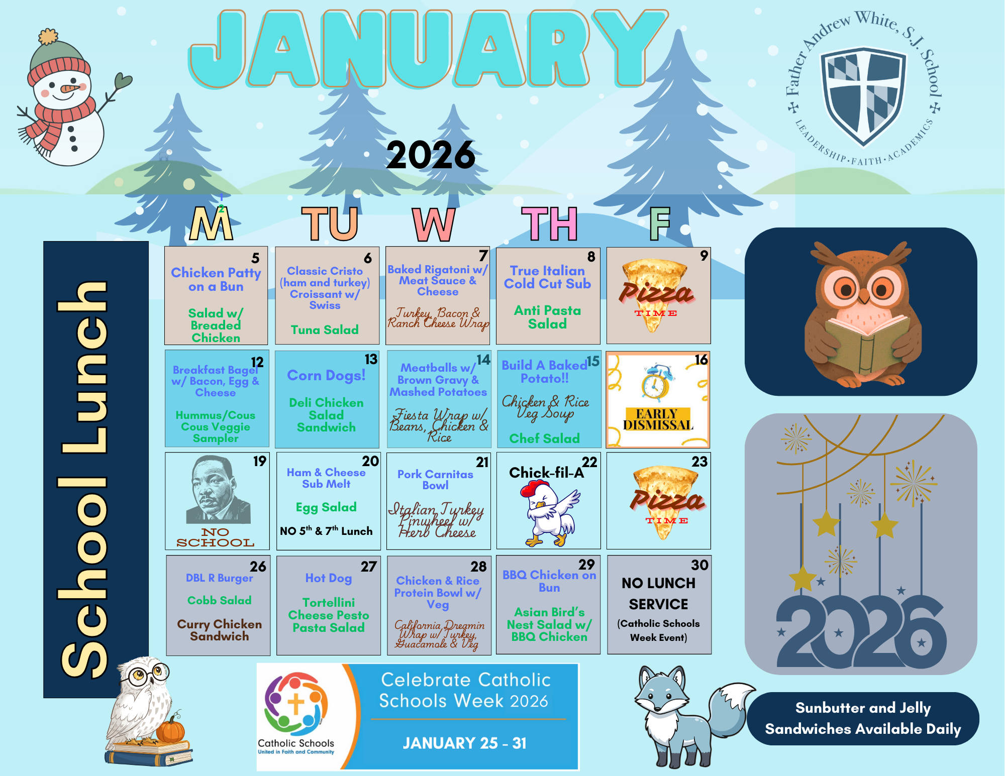 Orders are placed mostly on a monthly basis via the FACTS Family Portal. You will have two weeks to complete your order, and a reminder of the cut-off date will be sent. You may pay online using an electronic check or credit card. In order to keep the costs of lunch at $5.00, the transactions fees are paid by the customer. Orders must be paid by the cut-off date, or they will not be accepted for that month.