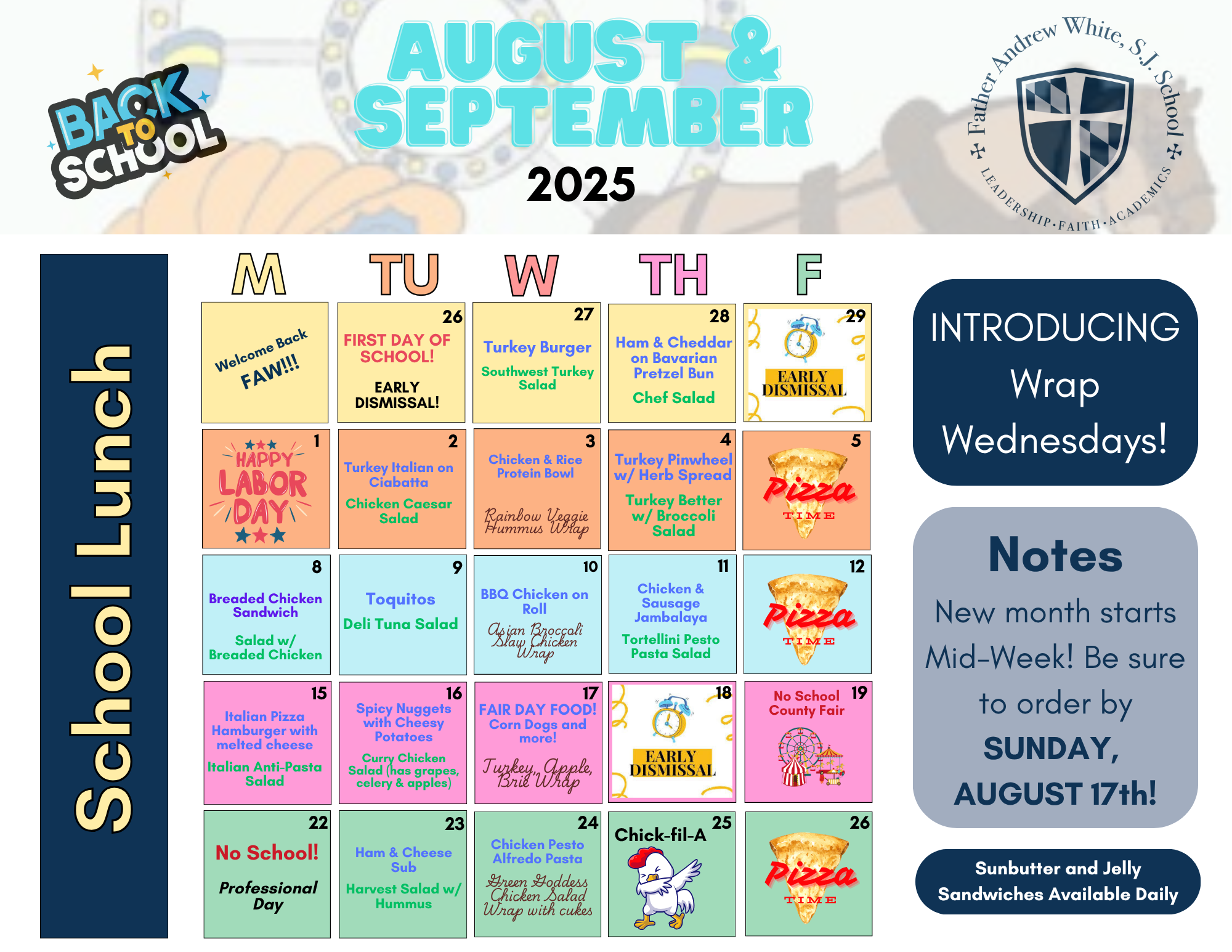Orders are placed mostly on a monthly basis via the FACTS Family Portal. You will have two weeks to complete your order, and a reminder of the cut-off date will be sent. You may pay online using an electronic check or credit card. In order to keep the costs of lunch at $5.00, the transactions fees are paid by the customer. Orders must be paid by the cut-off date, or they will not be accepted for that month.