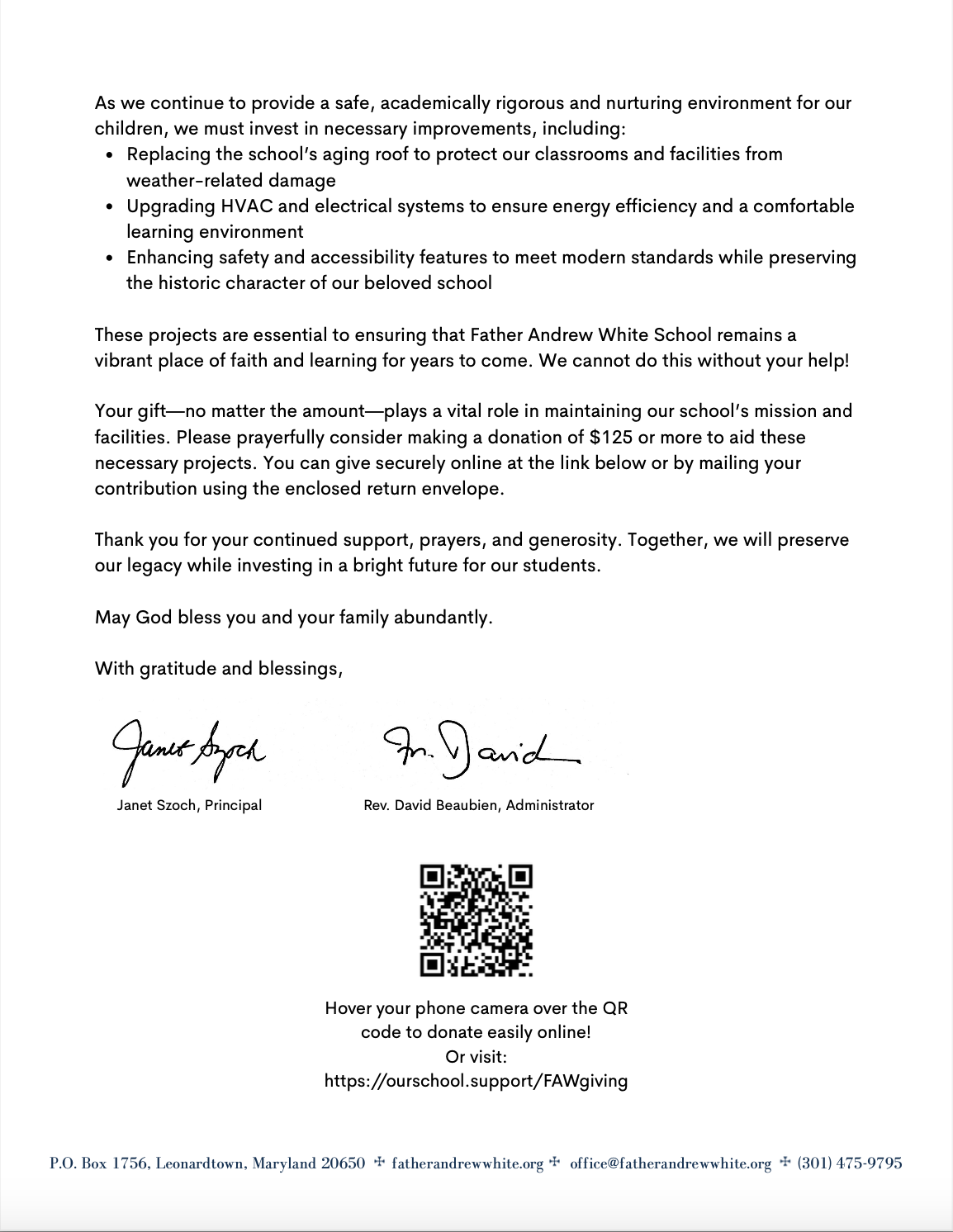 Leonardtown, MD 20650*Make checks payable to “Father Andrew White”