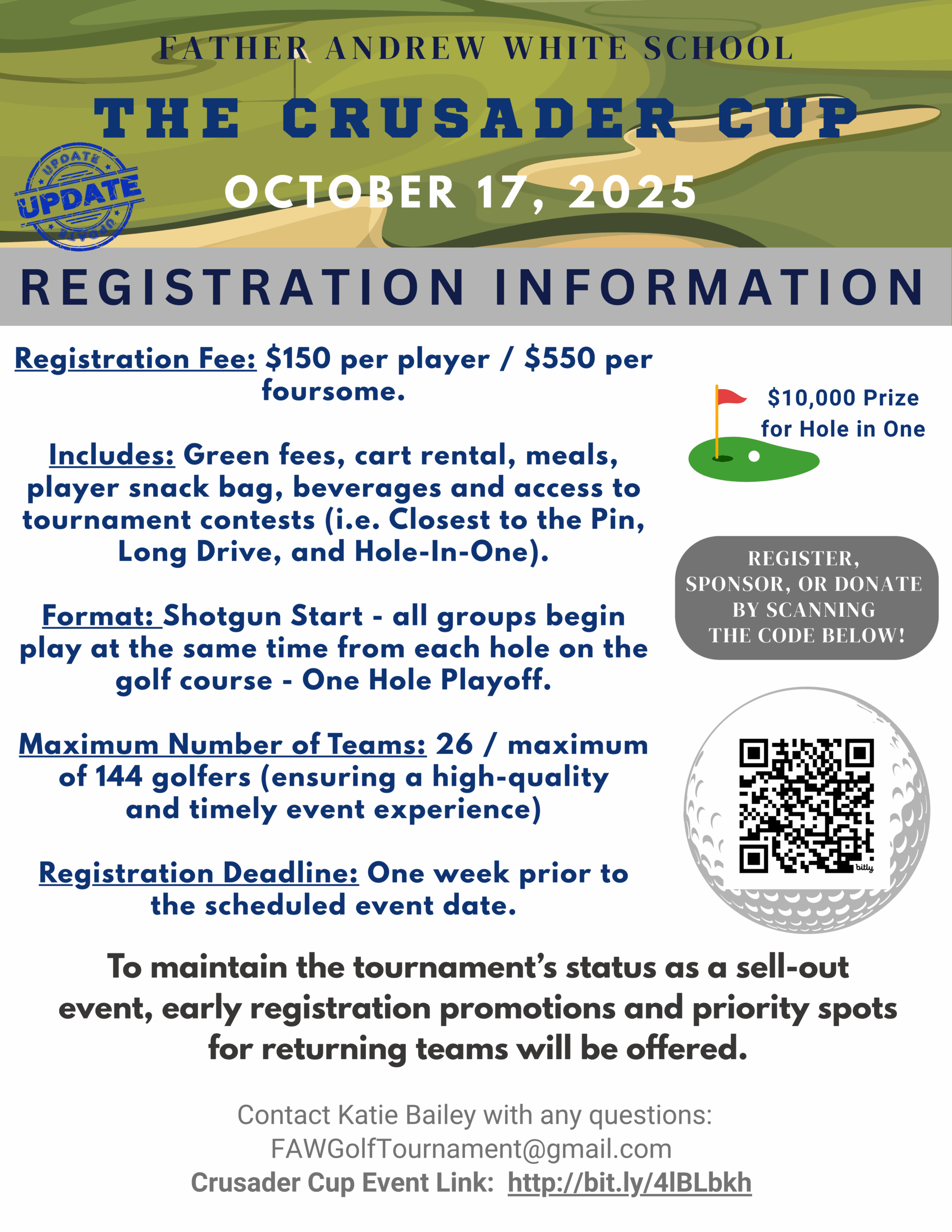 FAW Crusader Cup: It’s almost time for our 15th year of FAW’s Famous Golf Tournament. Join us for this can’t miss event on Friday, October 17th, 2025, just after the highly anticipated reopening of the newly reseeded Breton Bay Golf and Country Club.