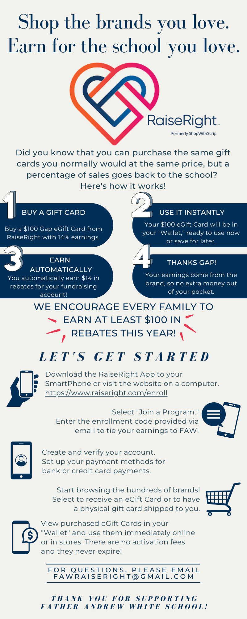 If you have not already done so, please sign up for a new family account at RaiseRight.com. You will need FAW’s unique enrollment code, which can be obtained by emailing FAWRaiseRight@gmail.com. It’s very quick and easy! Once you have created an account, you can shop for cards that support your everyday purchases. These electronic cards can be used for both online and in person shopping! You can easily pay with credit card, by linking your bank account, or by sending in payment to school. Please note that if cash or check is sent in, your purchase will not be available immediately but once payment has been received and processed.