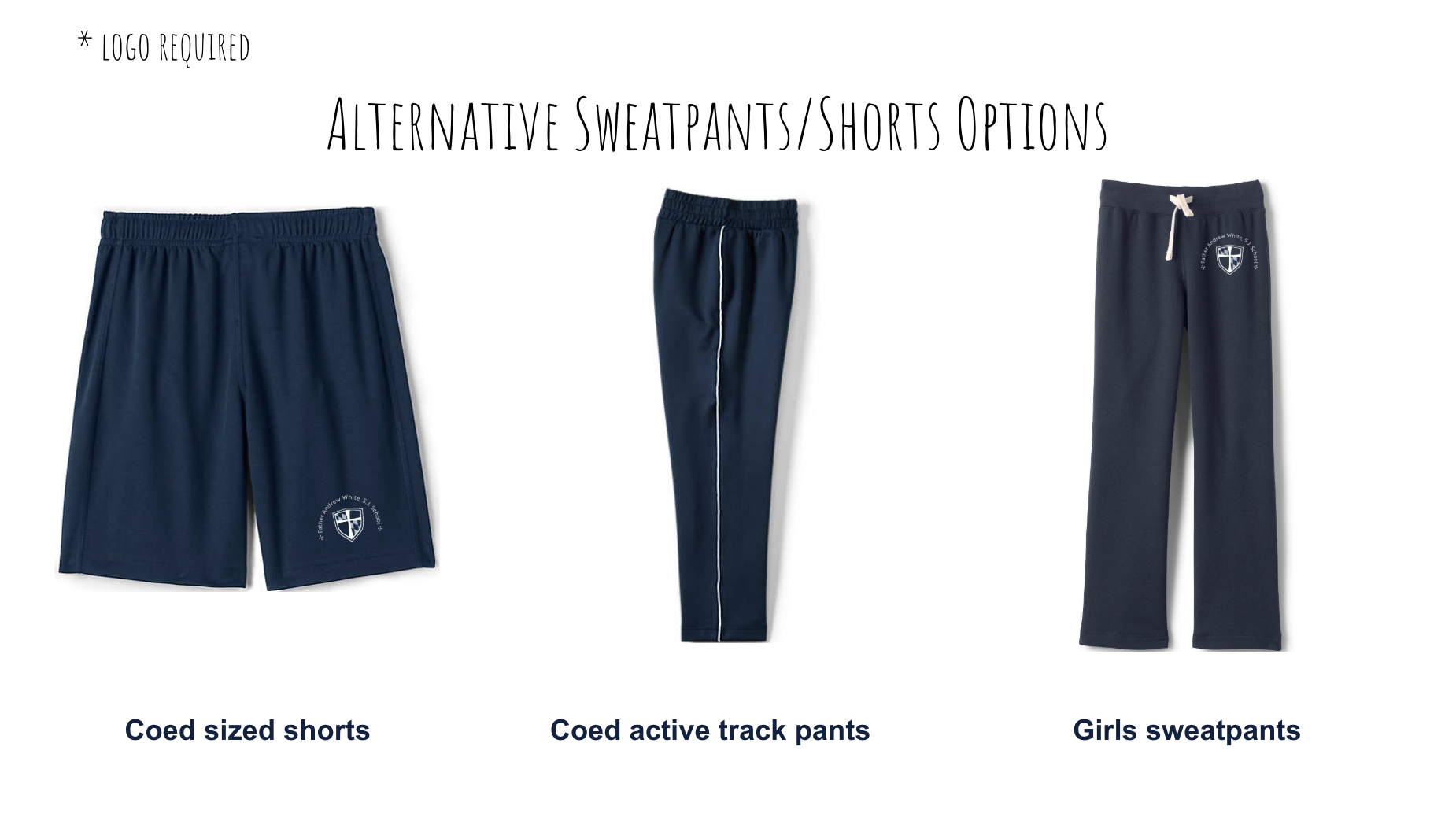 - Navy blue sweat pants with school insignia or navy blue elastic waist long slacks