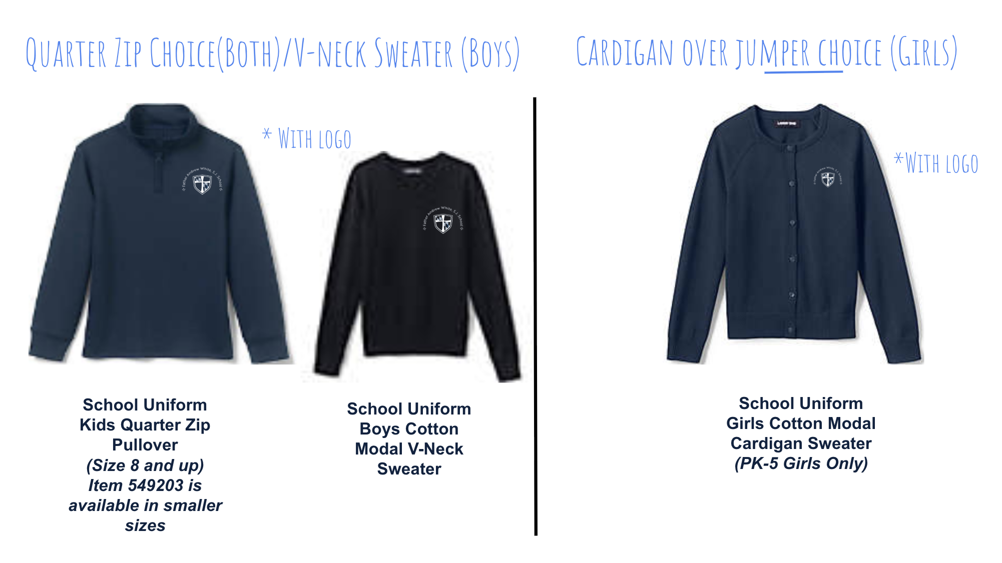 - Navy-blue cardigan sweater or 1⁄4 zip fleece with the school insignia (optional)